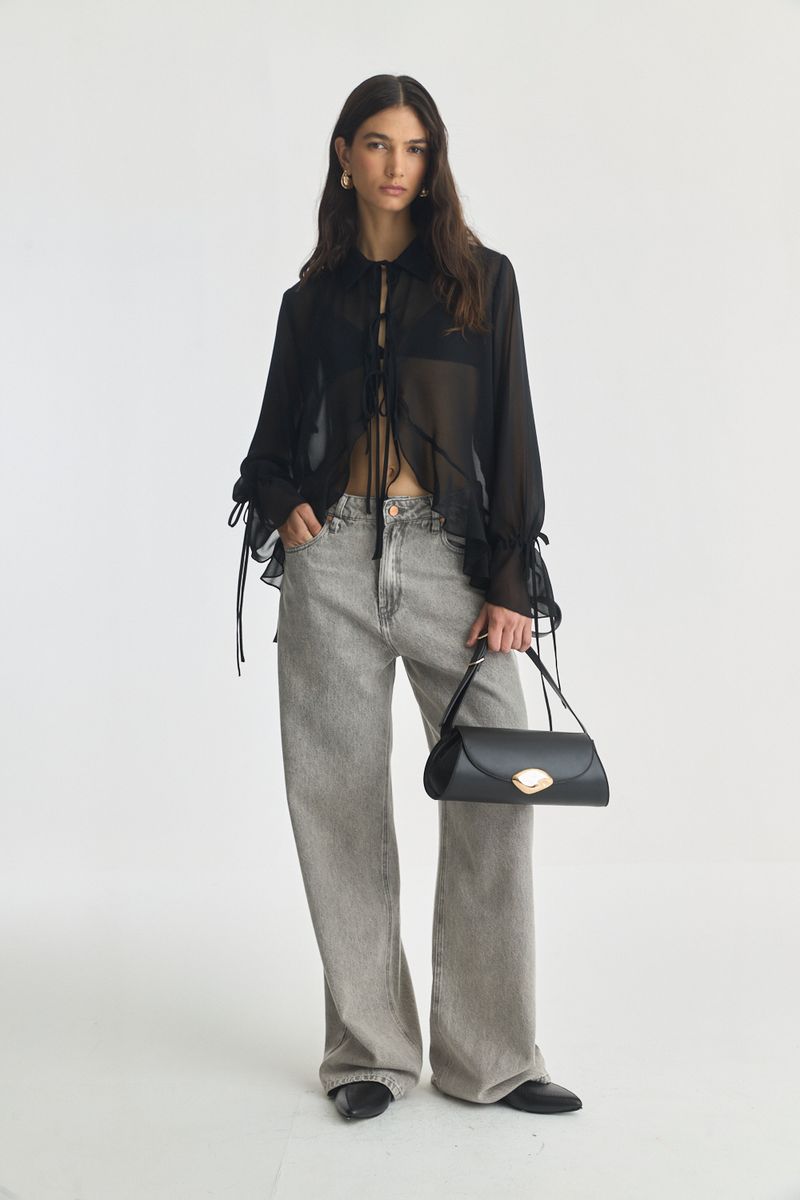 Camisa de estilo boho,escote en v con cuello y lazo para atar en cintura.tiene volados en el ruedo y en la manga.