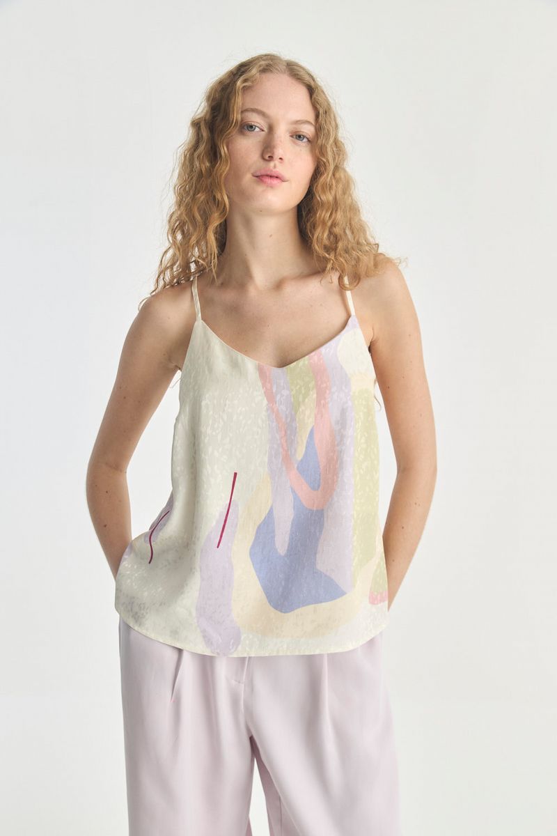 Top print jacquard con estampado digital.tiene escote en v con breteles finos y en espalda botón y ojal.
