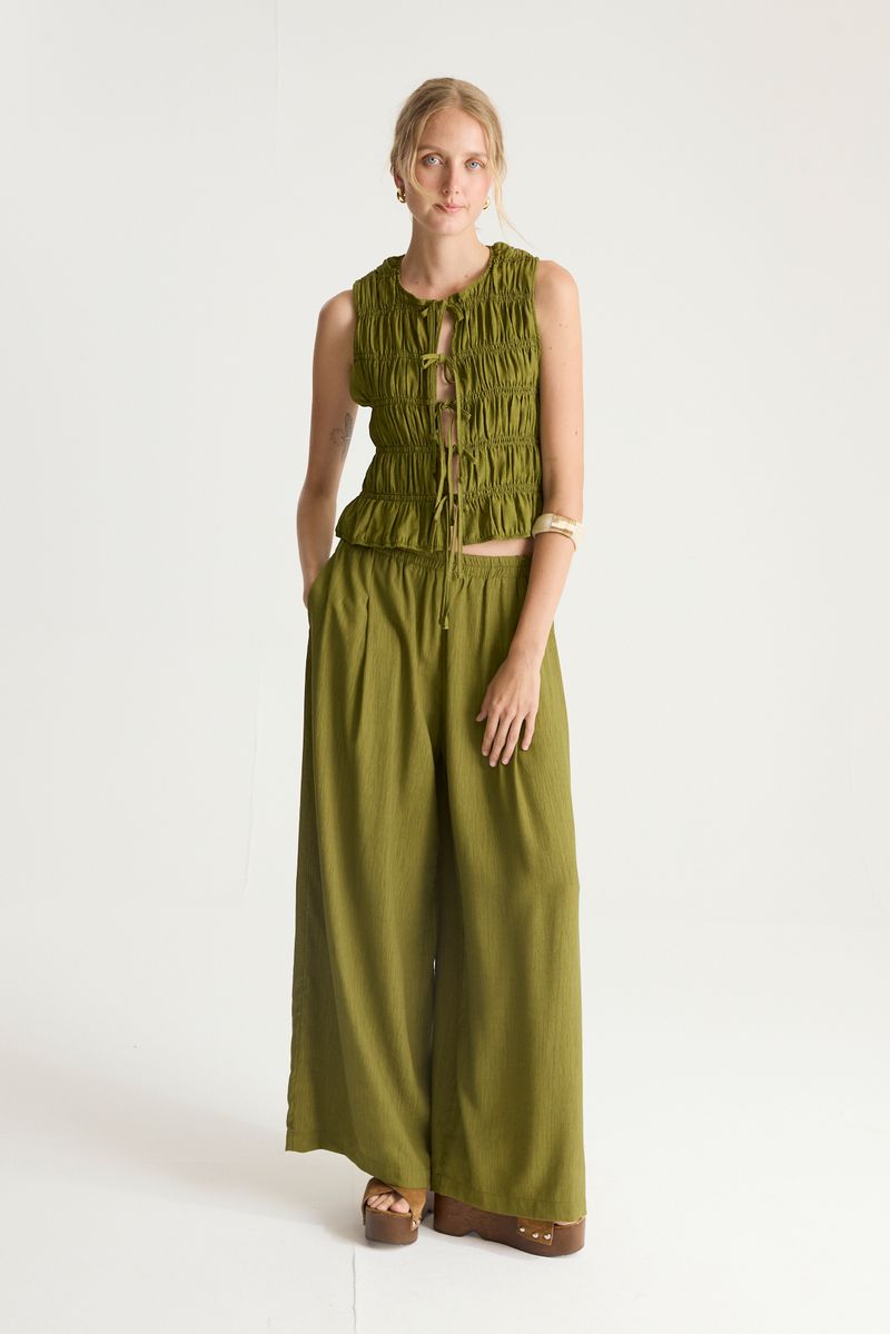 Top de tela tipo plisada, sin mangas con frunces en frente y moños.
