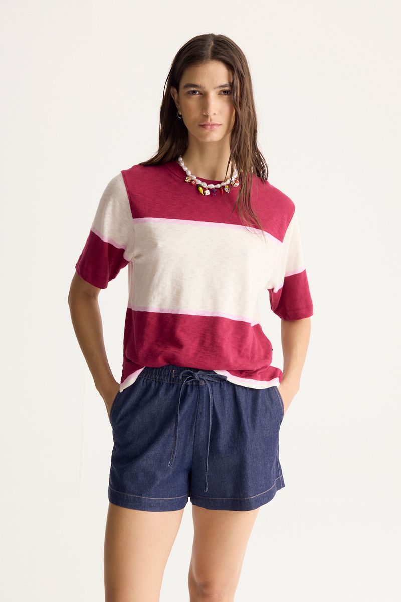 Remera de calce relajado con escote redondo y manga corta confeccionada en perú en jersey flamé rayado de calidda premium 100% algodon tanguis