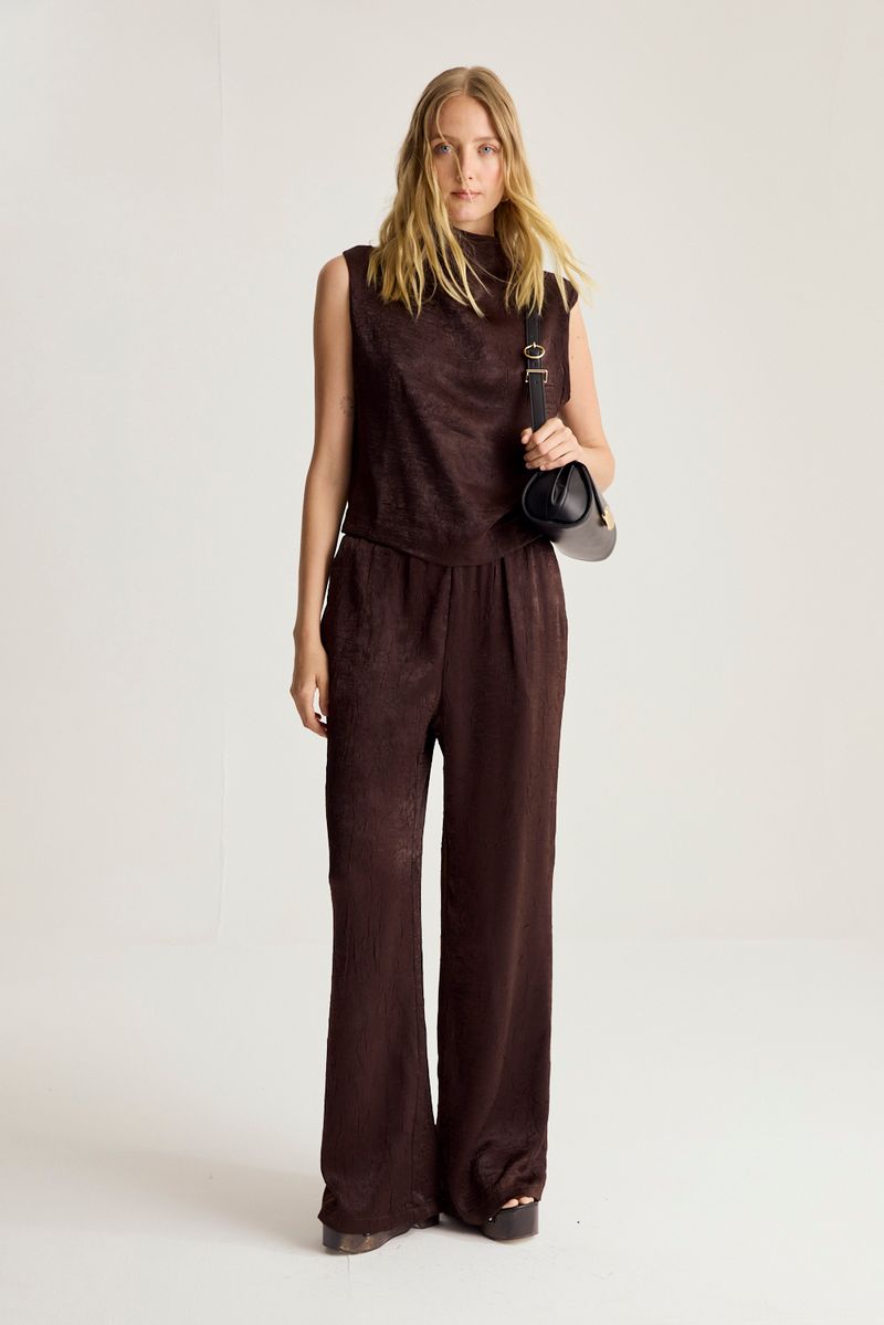 Pantalon de saten con textura quebrada . Lleva elastico en cintura, bolsillos en frente y su silueta es relax.
