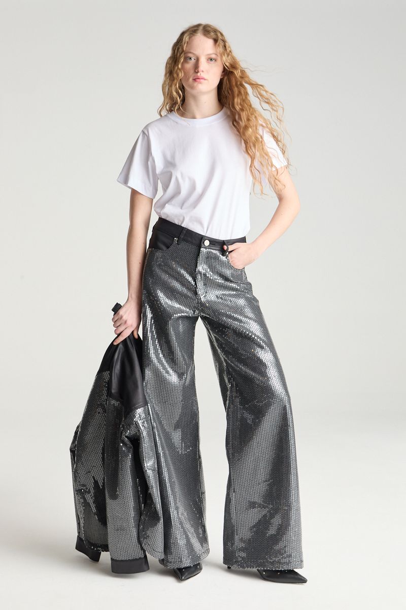 Jean de calce regular, tiro alto y con pierna bien ancha. Realizado en combinación de denim negro intervenido con lentejuelas transparentes en las piernas y tejido con efecto cuero en cintura