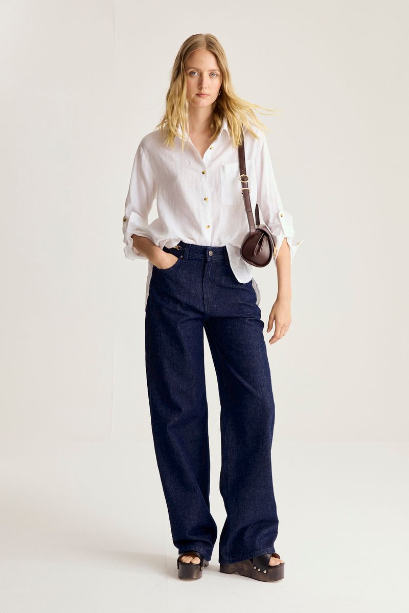 Jean de tiro alto y pierna recta con detalle de estribos metálicos sobre la cintura y ruedo dado vuelta. Lleva lavado estático.