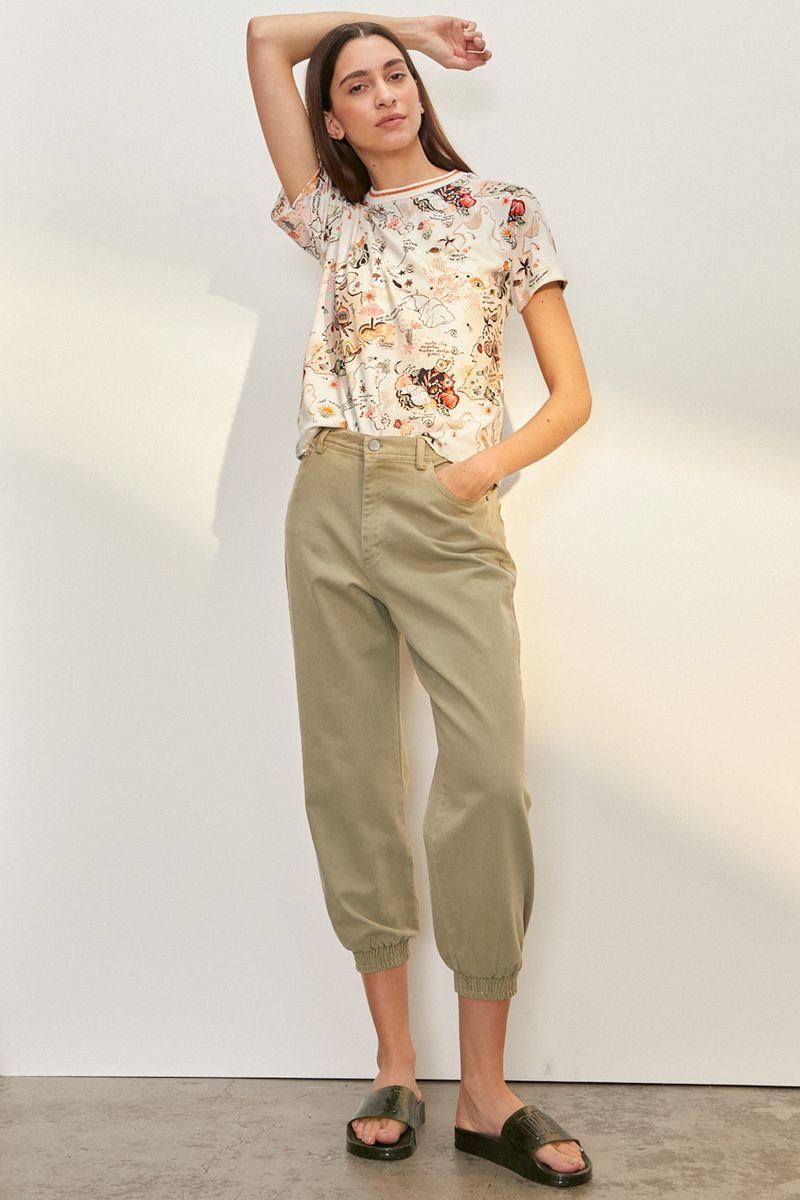Pantalon cargo, con elastico en bajo, bolsillos y cierre frontar con boton y elástico en cintura.