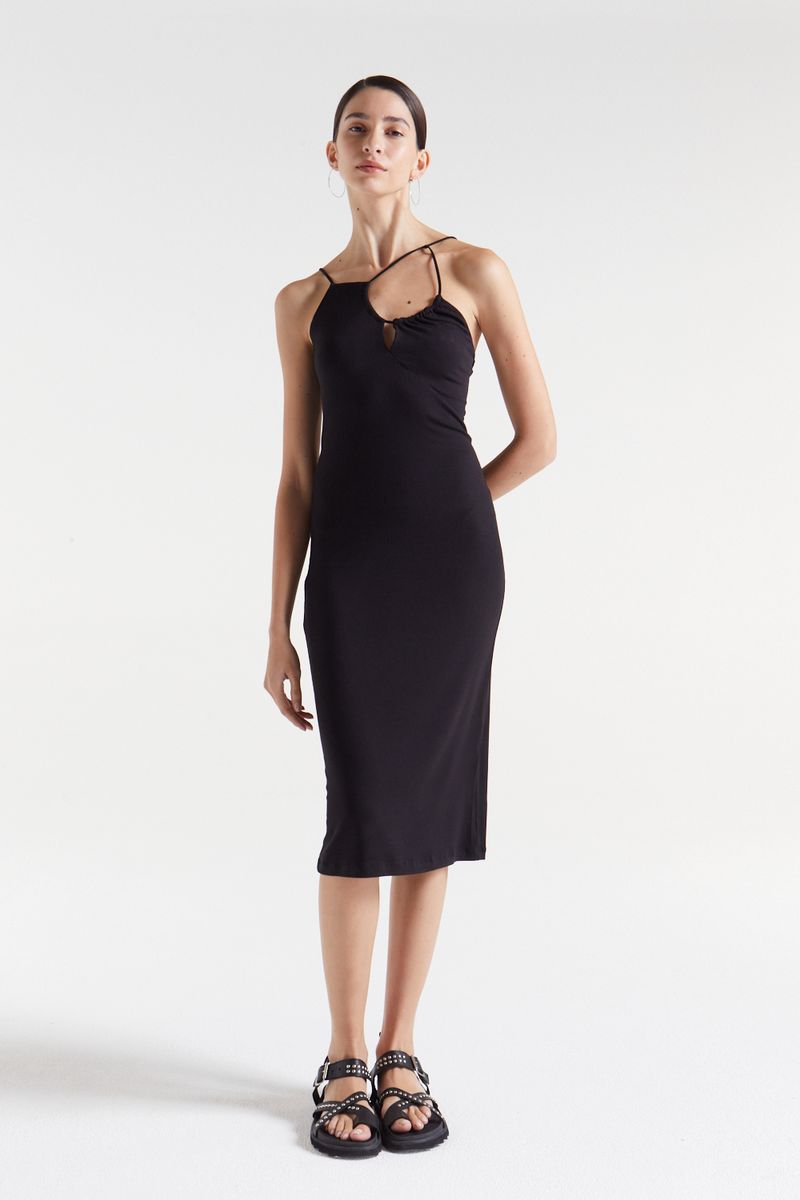 Vestido de calce ajustado con escote irregular, sustraccion y breteles finitos en viscosa con elastano