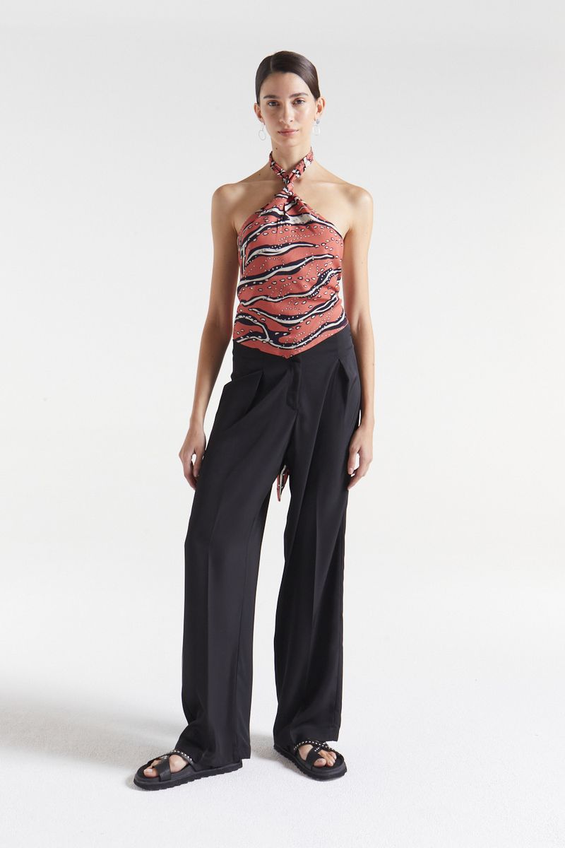 Top estampado con juego de moldería y drapeado en escote.termiación del frente en pico y espalda para atar.