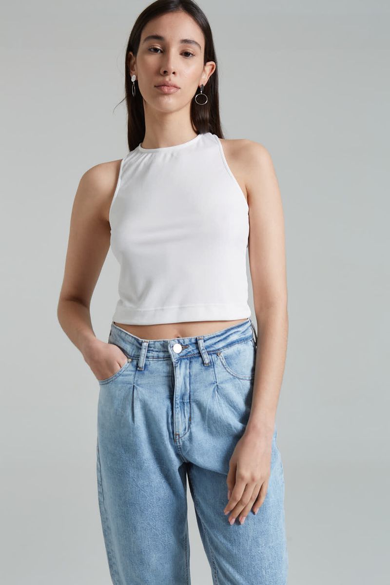 Musculosa de calce ajustado con escote redondo y detalle de cruce en espalda en ribb premium símil cupro