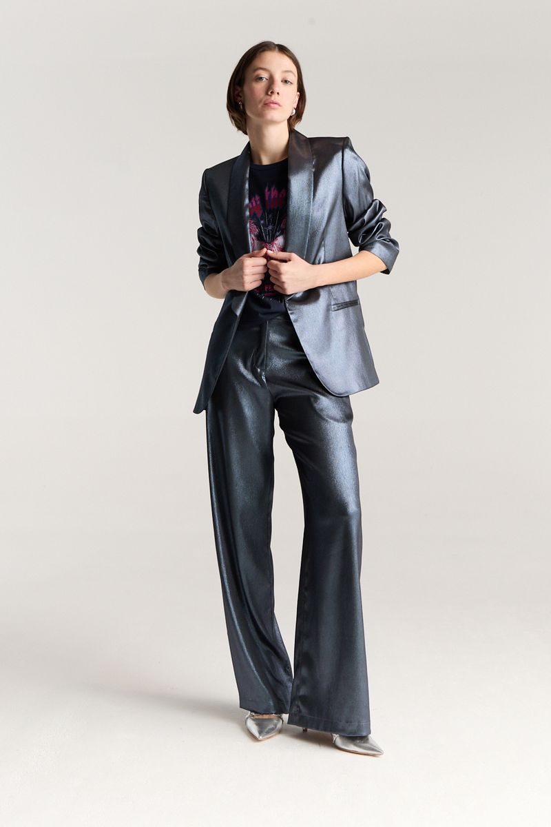 Blazer de noche tipo smokin, con bolsillos ojales en el delantero. Lleva un recorte en espalda con tajo. Genero con leve plisado y brillo.
