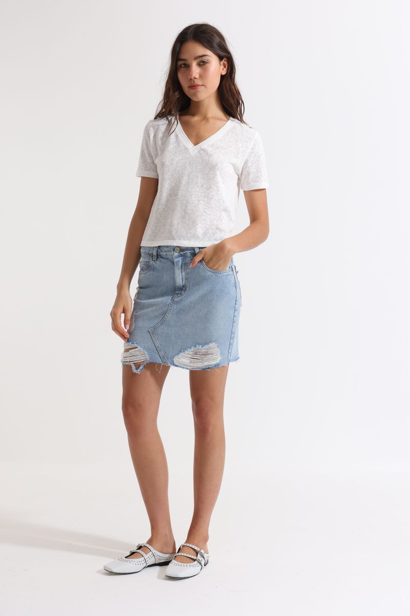 Falda corta de calce holgado, realizada en denim rígido con lavado variante celeste con roturas y negro liso