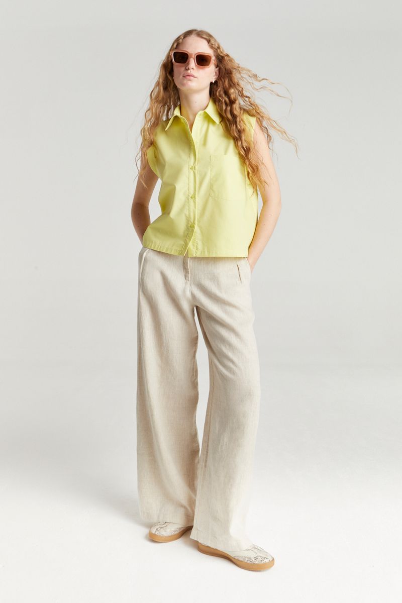 Camisa de calce regular en poplin de algodón. Tiene cuello y cartera, con botamanga en sisa y un bolsillo plaqué en frente. Tiene tablón en espalda con pespunte.