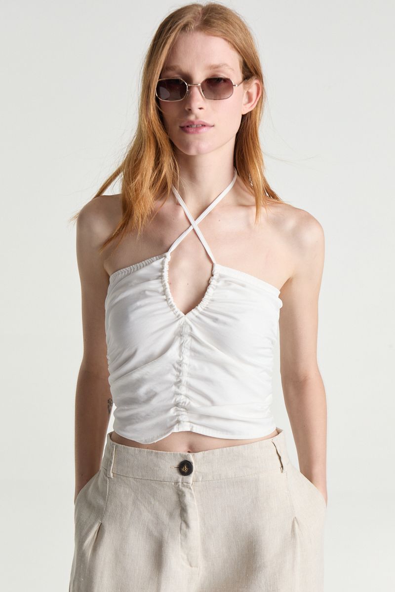 Top liso confeccionado en lino mezcla, de calce ajustado, con frunce y jareta en frente con lazo para atar. Tiene elástico en espalda.