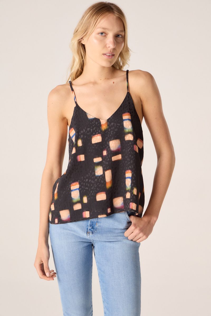 Top estampado escote en v de calce regular, con breteles finos y arandelas y reguladores.