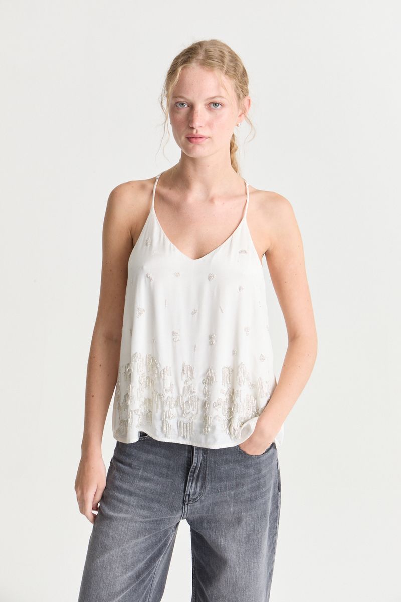 Top de calce regular bordado con motivo fantasía, escote en breteles finos