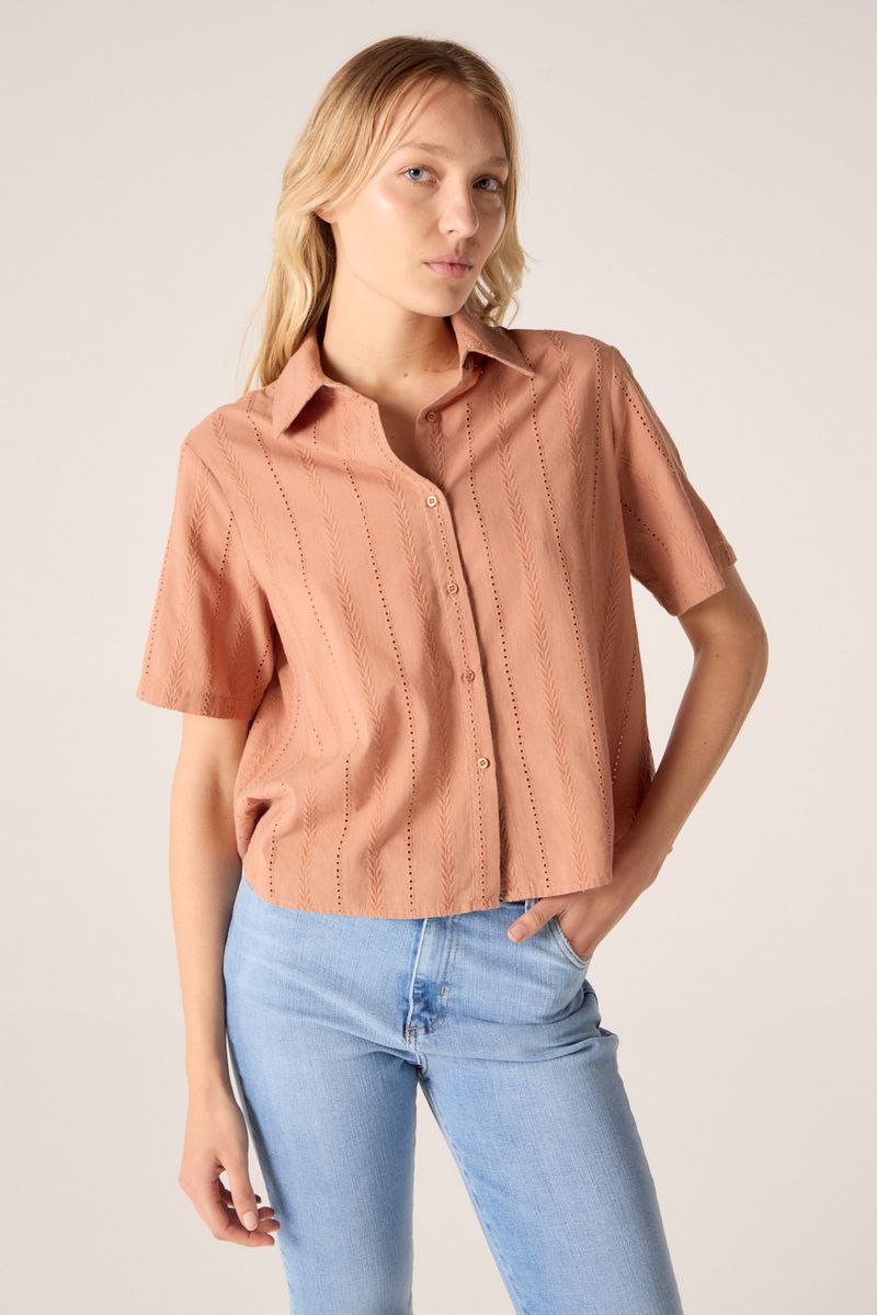 Camisa de calce regular confeccionada en un algodón bordado, manga corta con cuello y cartera. Tiene tajos laterales.