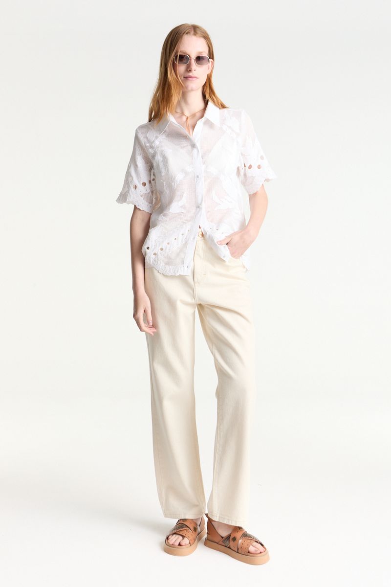 Camisa bordada confeccionada en red de algodón de calce regular con cuello camisa.