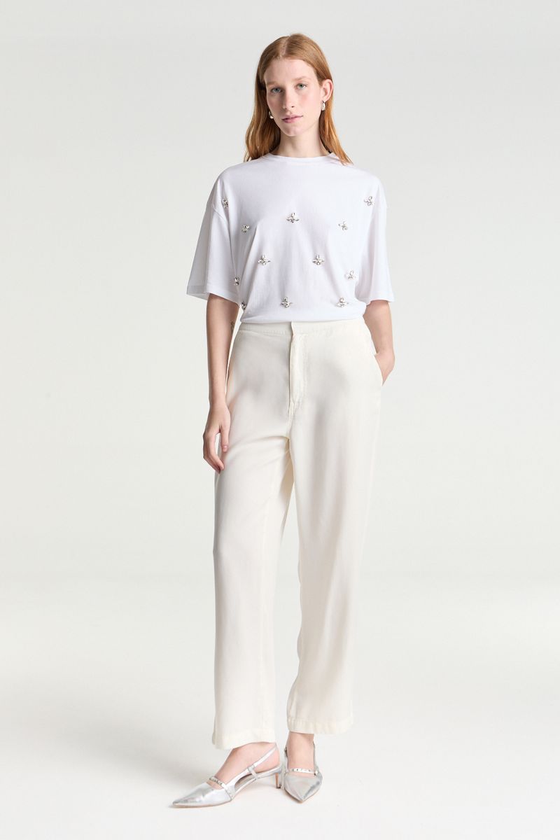 Pantalón confeccionado en 100%lyocell,con cintura elástica en espalda, bolsillos ojales en espalda.