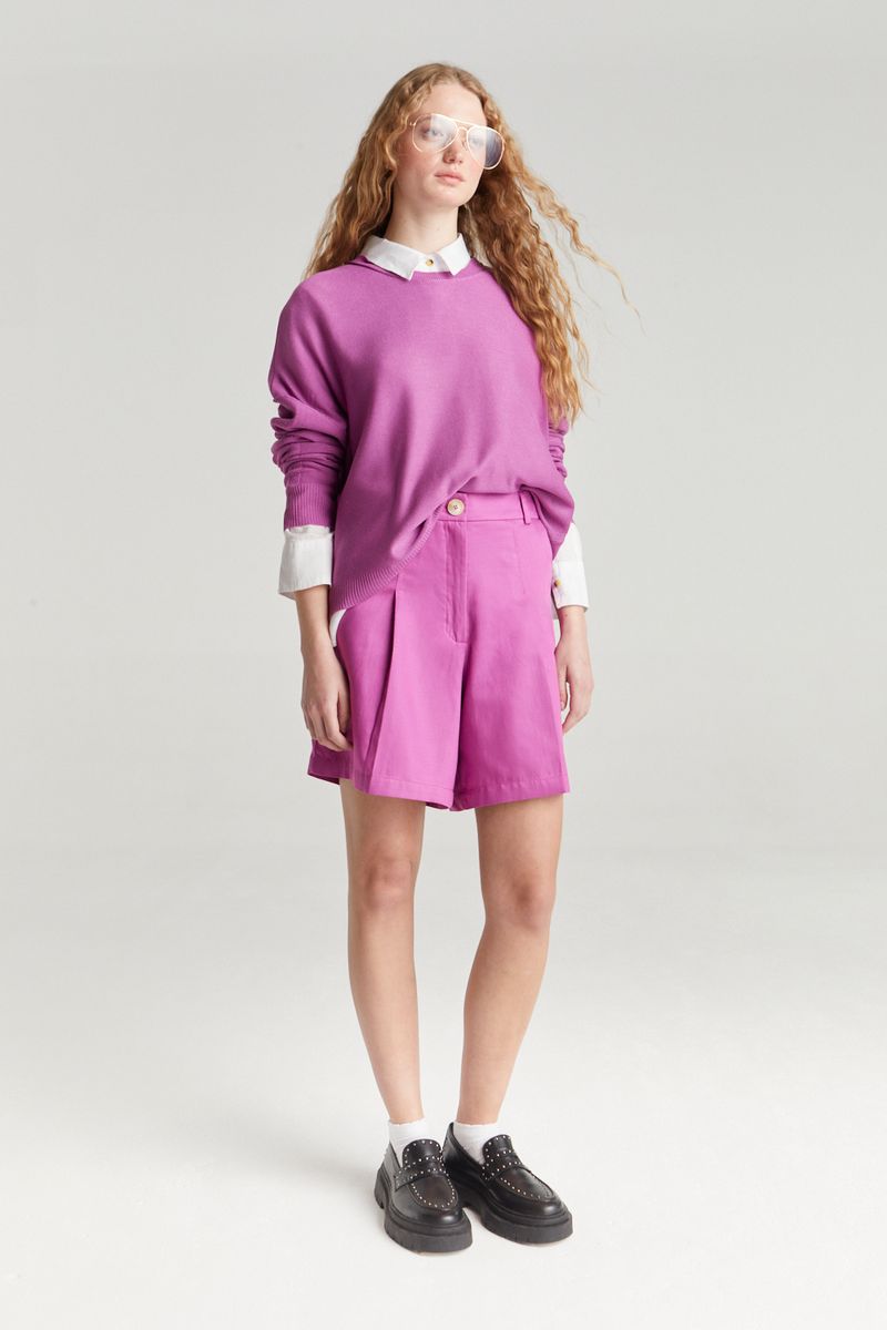 Bermuda sastrera de lyocell twill, tiro alto con pinzas en el delantero, botón logueado y cartera con cierre. Este genero es 100%lyocell y pertenece a la capsula sostenible