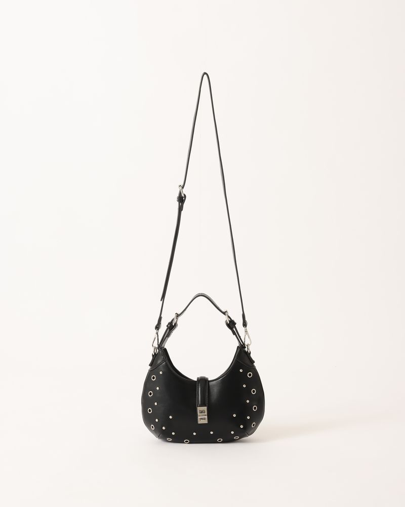 Cartera realizada en vegan leather con ojalillos y tachas, posee detalle de hebillas en manija, y correa larga opcional. Sus medidas son 25 cm de alto y 21 cm de ancho.