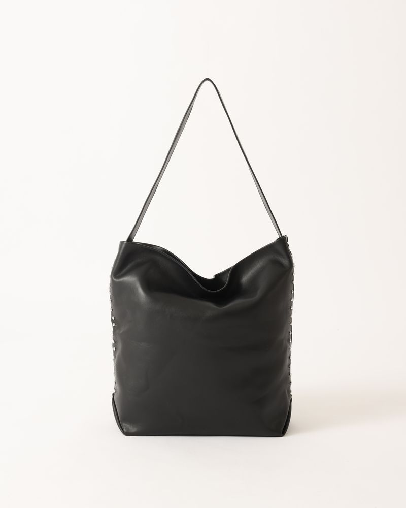 Tote realizada en vegan leather, con detalle de tachas en laterales y cierre central. Sus medidas son 38 cm de alto, 41 cm de ancho y 3 cm de profundidad