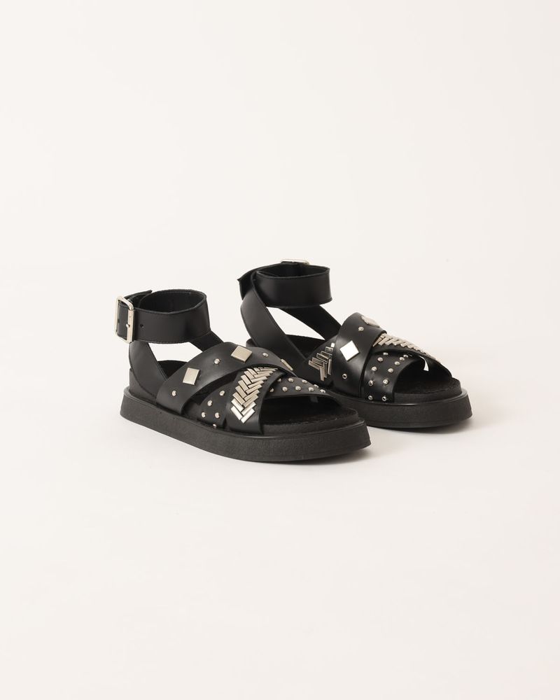 Sandalia realizada en cuero vacuno, de tiras cruzadas con detalles de tachas y plantilla birk