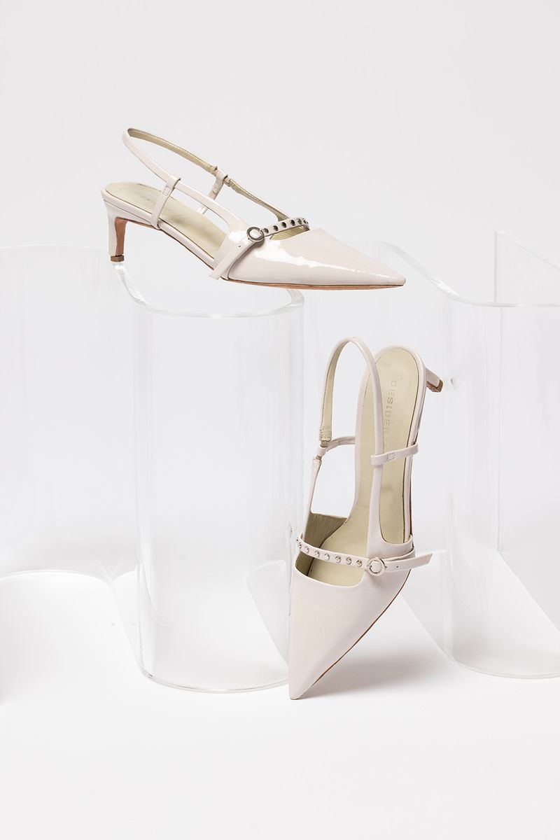 Zapato en punta y taco fino, realizado en cuero charolado con detalle de tachas y hebilla