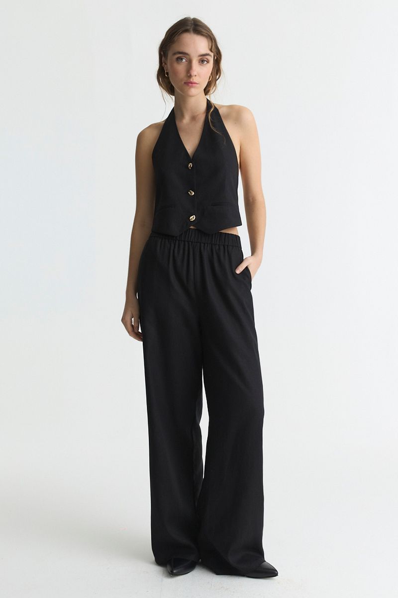 Chaleco de lino viscosa, tipo top con espalda baja . Lleva botones en frente de metal y regulador en espalda para ajustar a la medida que se desee