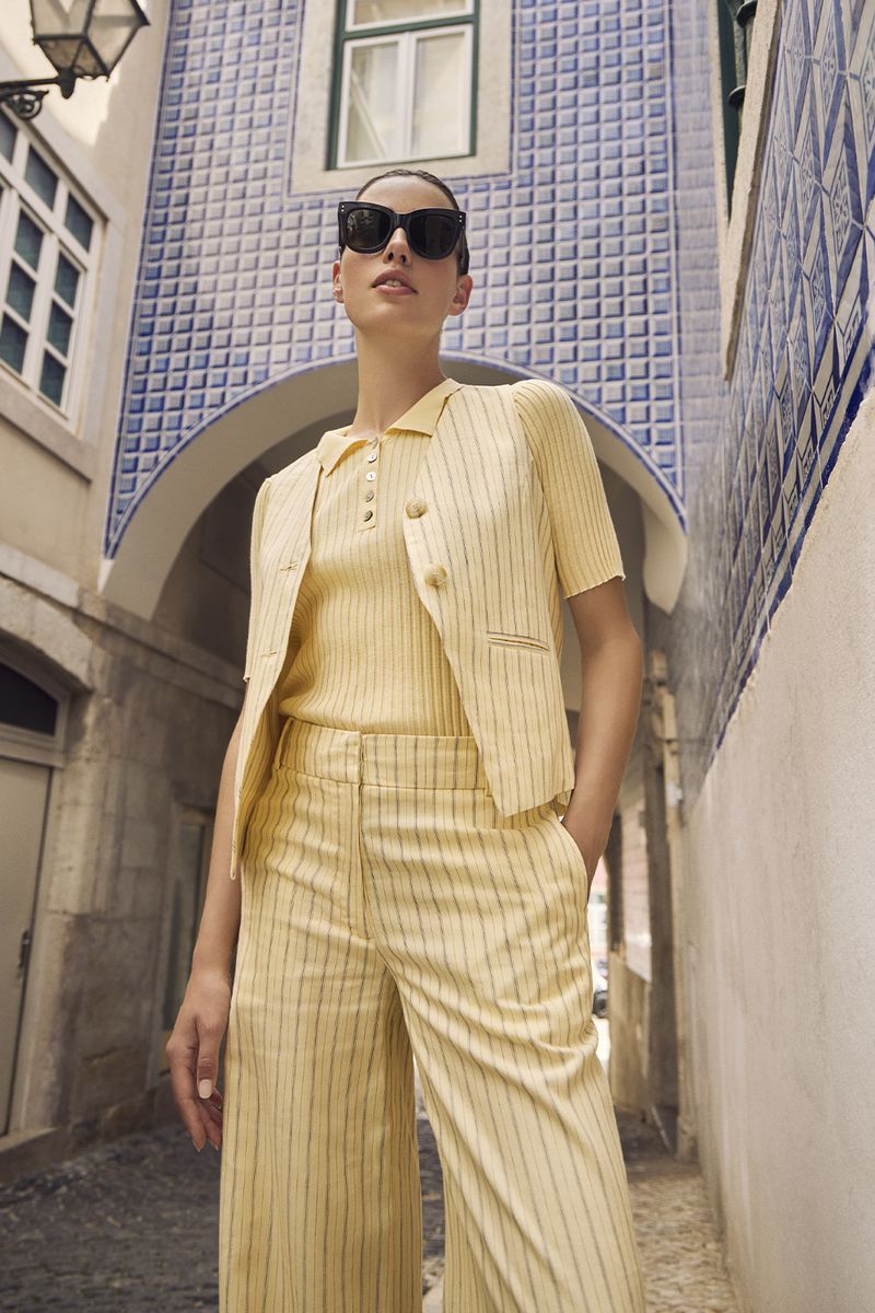 Chaleco rayado de lino algodon, con cuello sastrero tipo blazer con solapa. En cruce lleva 3 botones en off white . Frente con bolsillos con tapa.