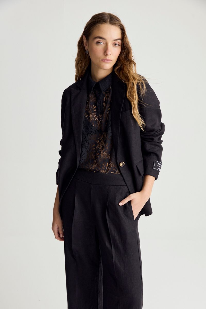 Blazer 100% lino largo hasta la cadera. Lleva en frente cruce con boton y bolsillo con tapa. Este blazer es un clasico atemporal para todas las temporadas