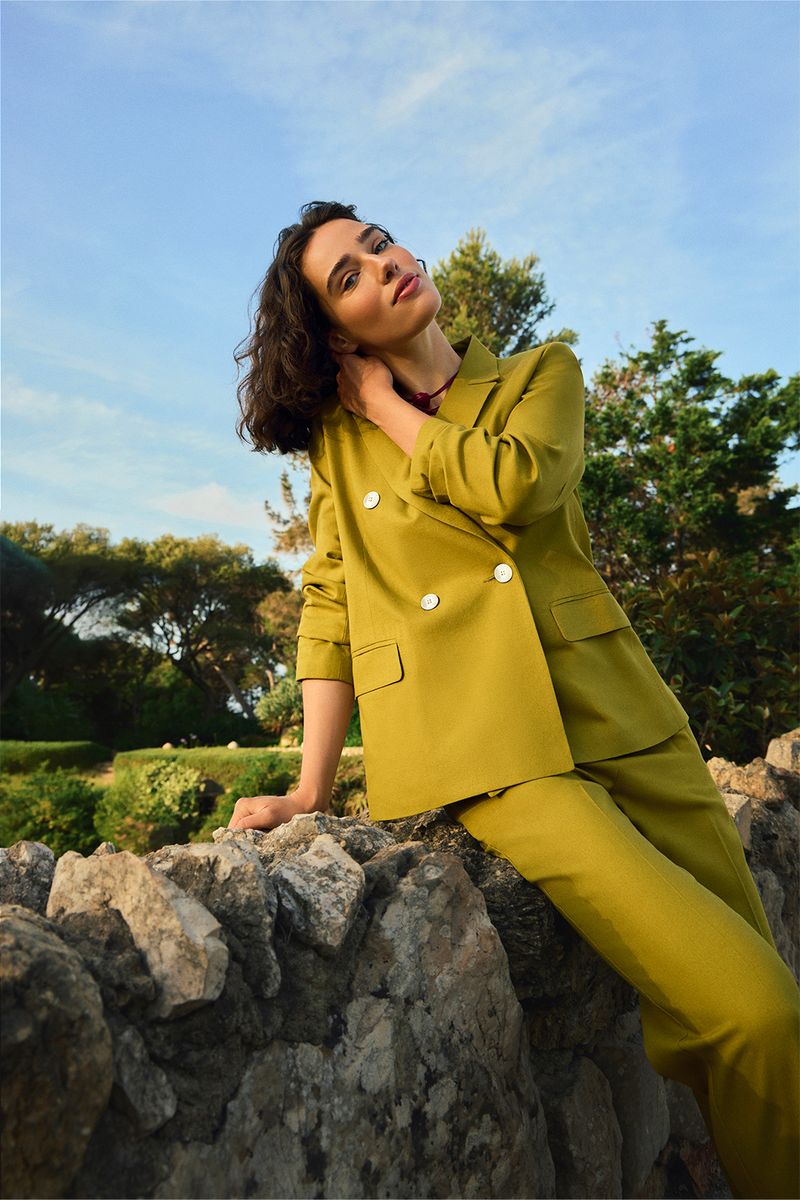 Blazer sastrero con lino en su composicion. Cuello solapa y manga larga con hombreras. Cierre frontal cruzado con 4 botones. Bolsillos delanteros con solapa.