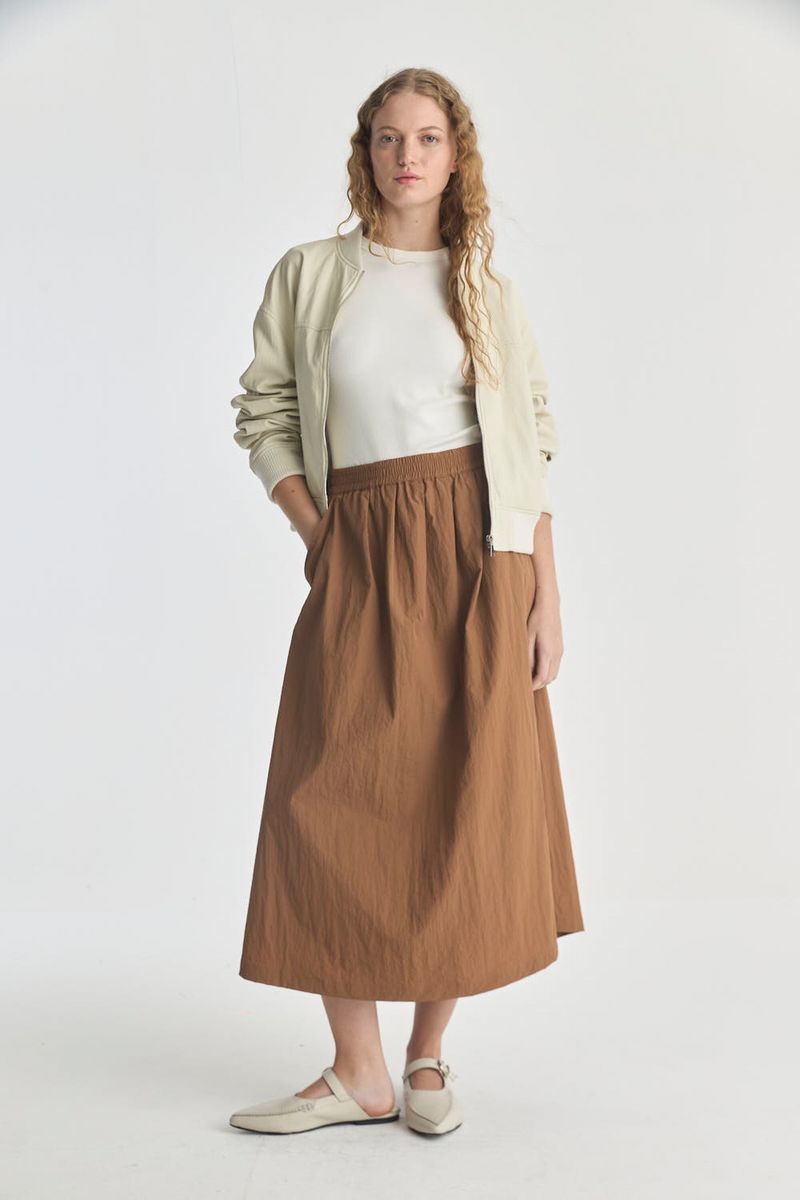 Falda midi de tiro alto y cintura con elástico. Tiene detalle de tabla en la cintura y bolsillos laterales. Falda con mucho vuelo realizada en tejido tipo tech