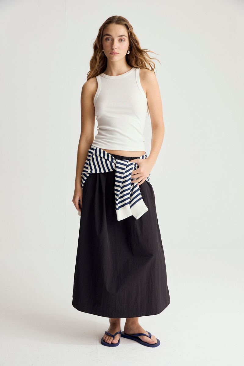 Falda midi de tiro alto y cintura con elástico. Tiene detalle de tabla en la cintura y bolsillos laterales. Falda con mucho vuelo realizada en tejido tipo tech