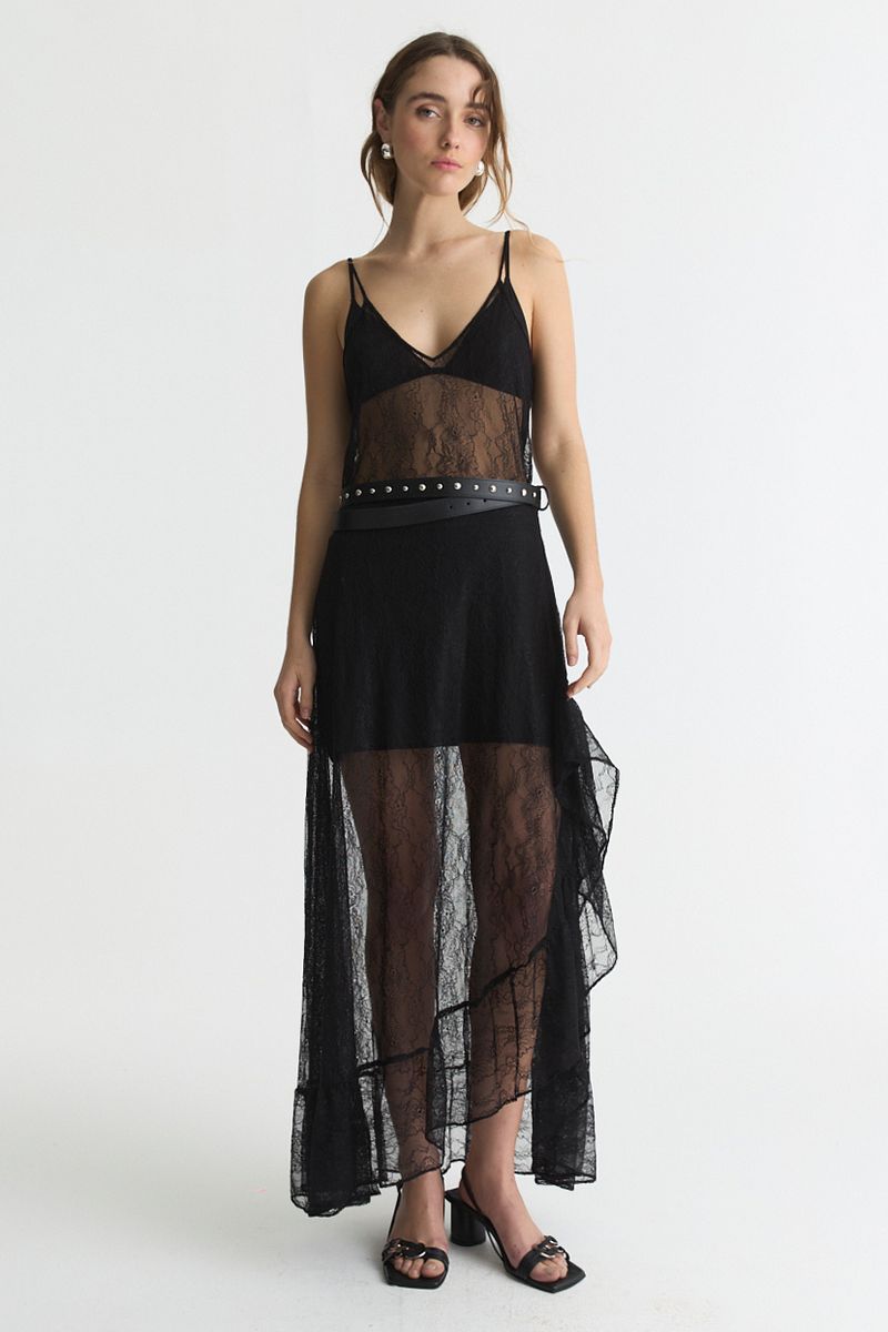 Falda de calce holgado con largo irregular y volado en los ruedos. Realizado en encaje con dibujo floral, acceso lateral a traves de cierre invisible