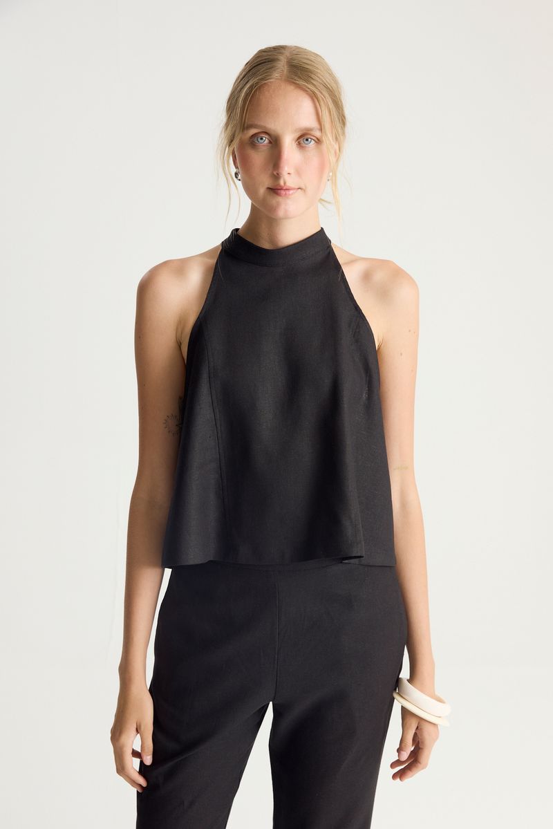 Top de lino, escote redondo, ruedo en v y detalle en espalda con recorte y lazos para atar como lo desees.