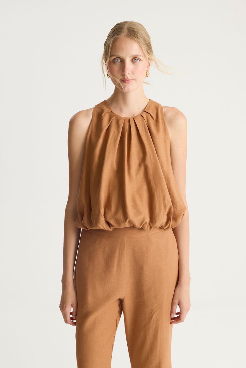 Top balloon con cuello a la base, pliegues y ruedo balloon. en al espalda lleva una gota y tira para atar. contine lino en su composicion
