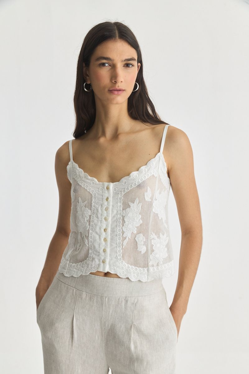 Top confeccionado en una red de algodón bordada,con bretel fino con reguladores y calce ajustado.