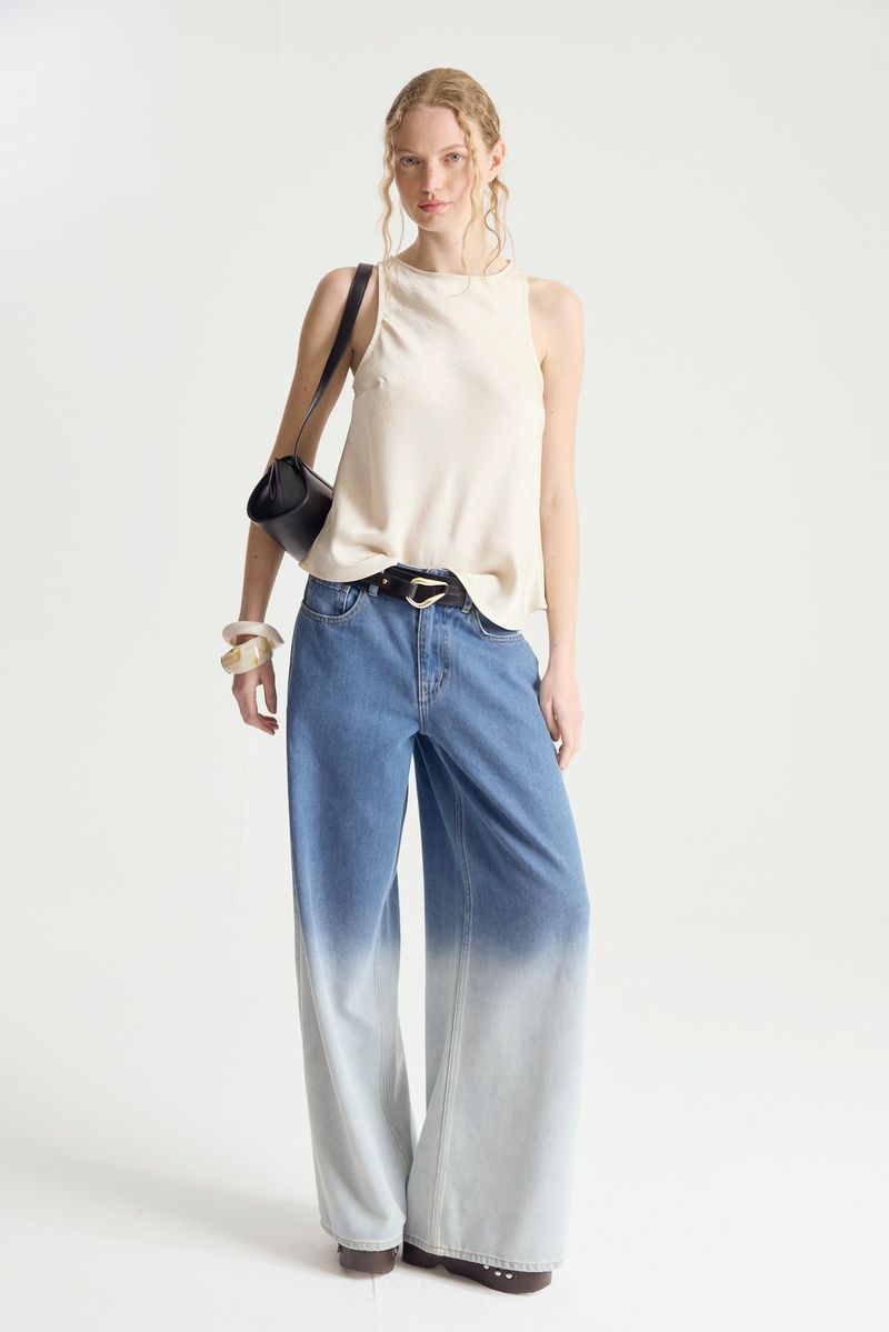 Top sin mangas de calce bien holgado, escote tipo halter y mucho vuelo hacia los ruedos. realizado en satén liviano con caída
