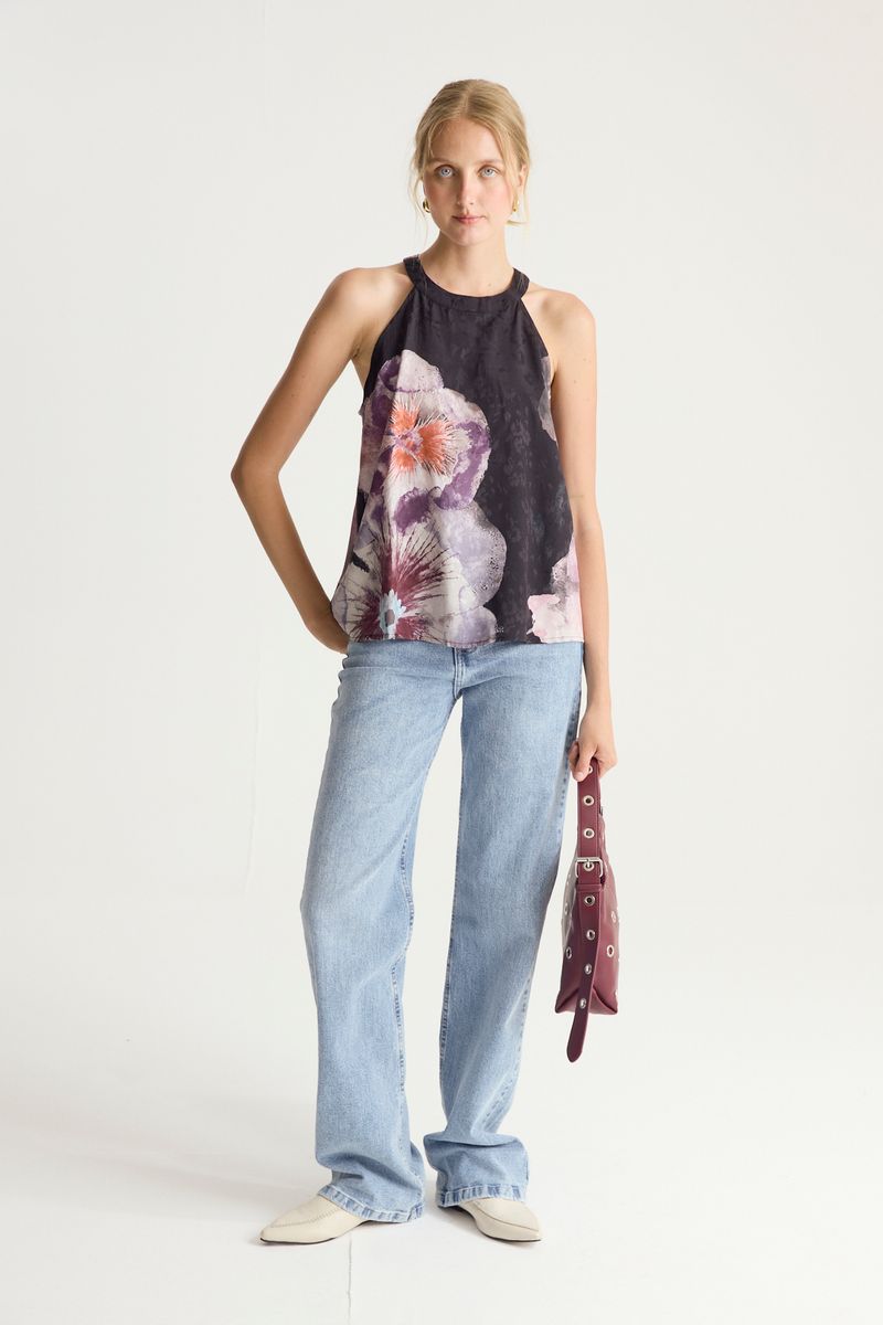 Top estampado confeccionado en jacquard viscosa,con escote halter y espalda escotada.
