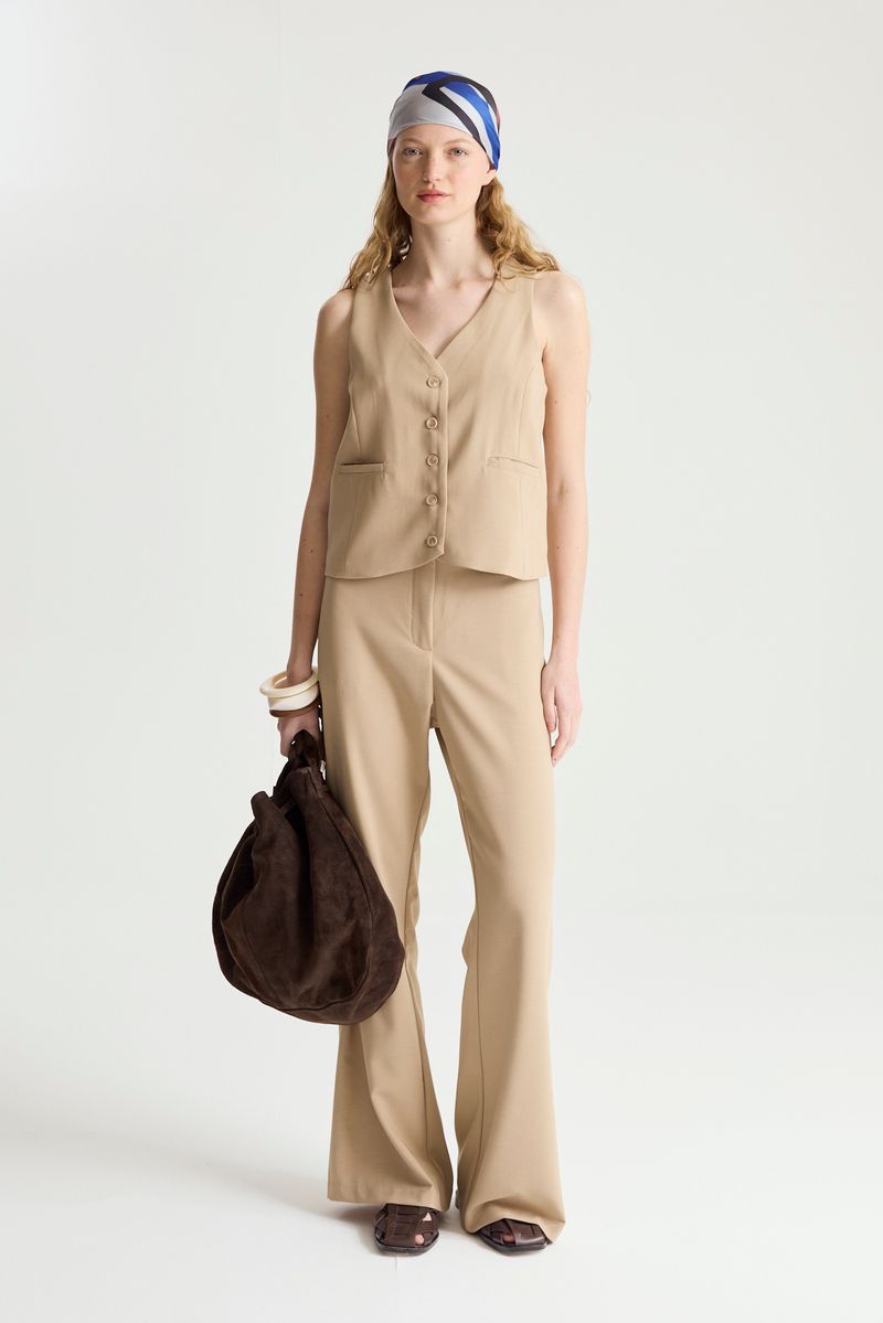 Pantalon sastrero tiro alto, con bolsillos laterales y bolsillo ojal en espalda. Pierna recta mas amplia en ruedo.