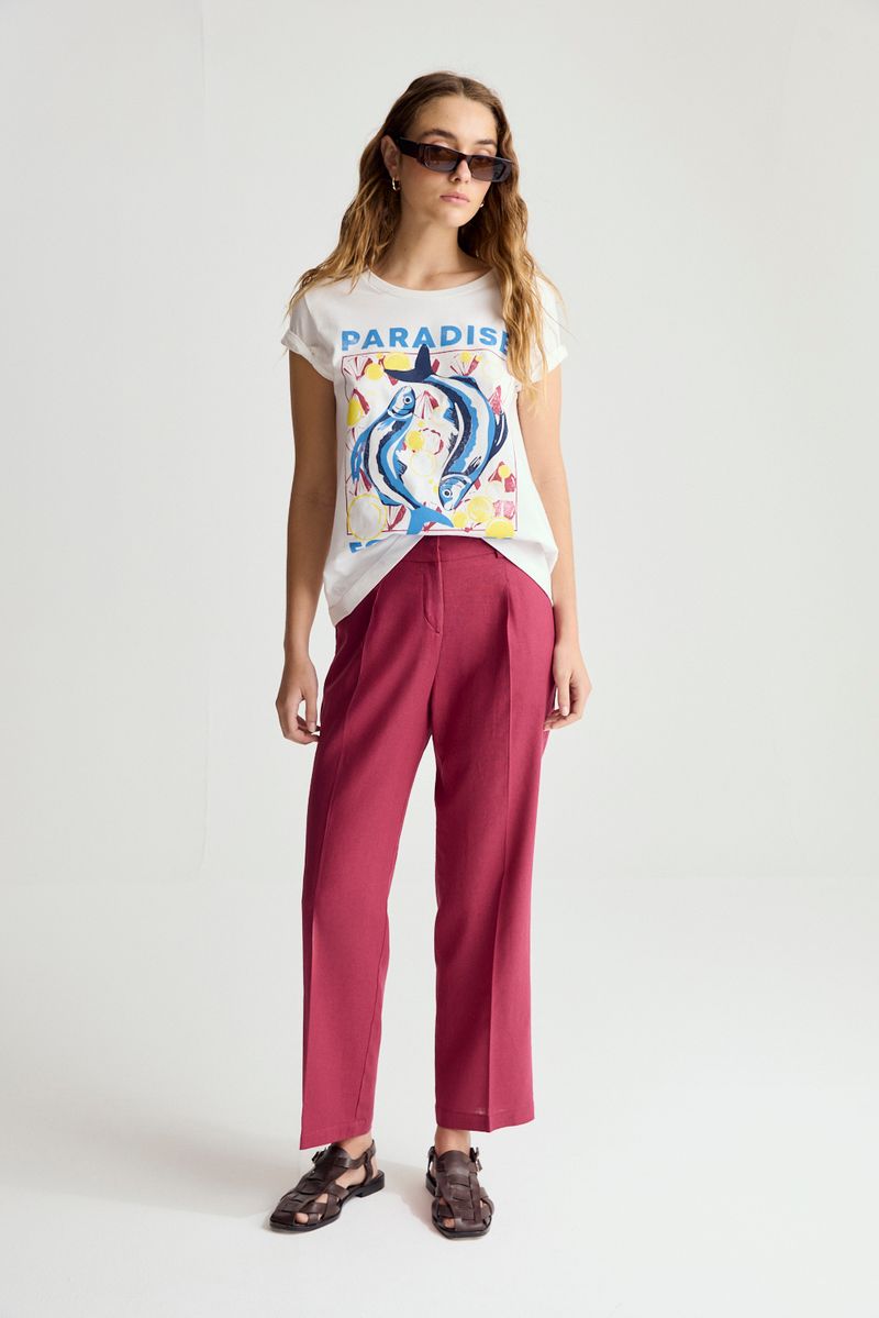 Pantalón sastrero con lino en su composicion. Tiro alto, con bolsillos laterales y elastico en la cintura trasera. Largo al tobillo, pierna recta.
