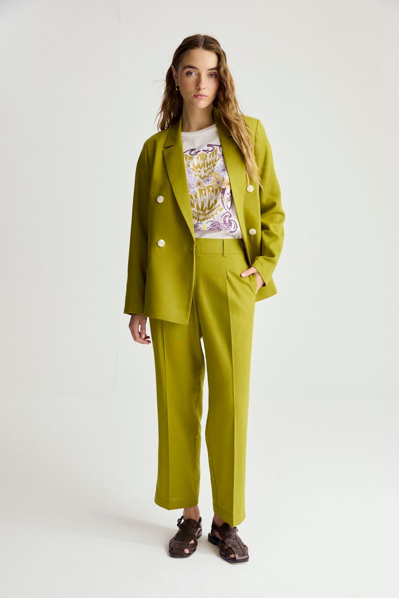 Pantalón sastrero con lino en su composicion. Tiro alto, con bolsillos laterales y elastico en la cintura trasera. Largo al tobillo, pierna recta.