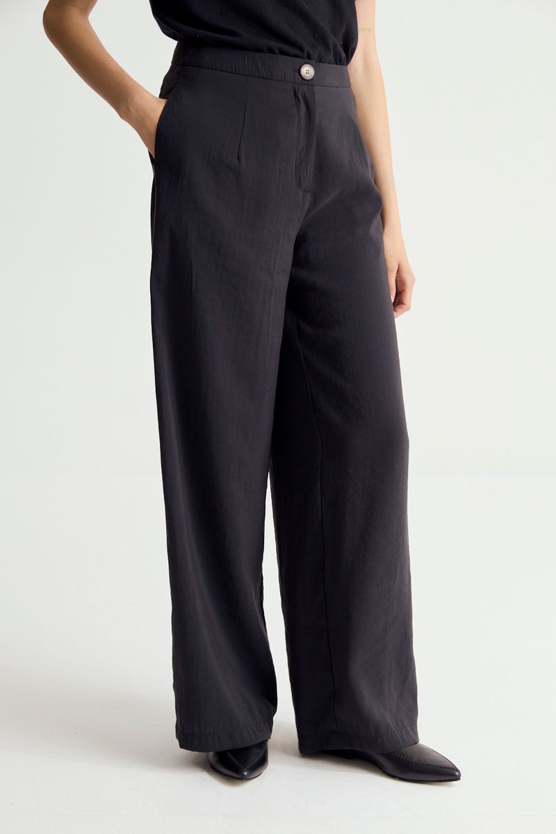 Pantalon ancho de genero sastrero liviano. Tiro alto con boton en cintura y bolsillos laterales. Lleva dos pinzas en delantero para dar amplitud y comodidad a la prenda