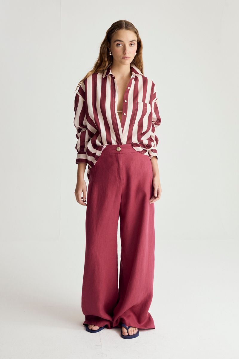 Pantalon 100%lino ancho, con bolsillos laterales, cintura con boton de pasta marcario y bolsillos ojal en la espalda