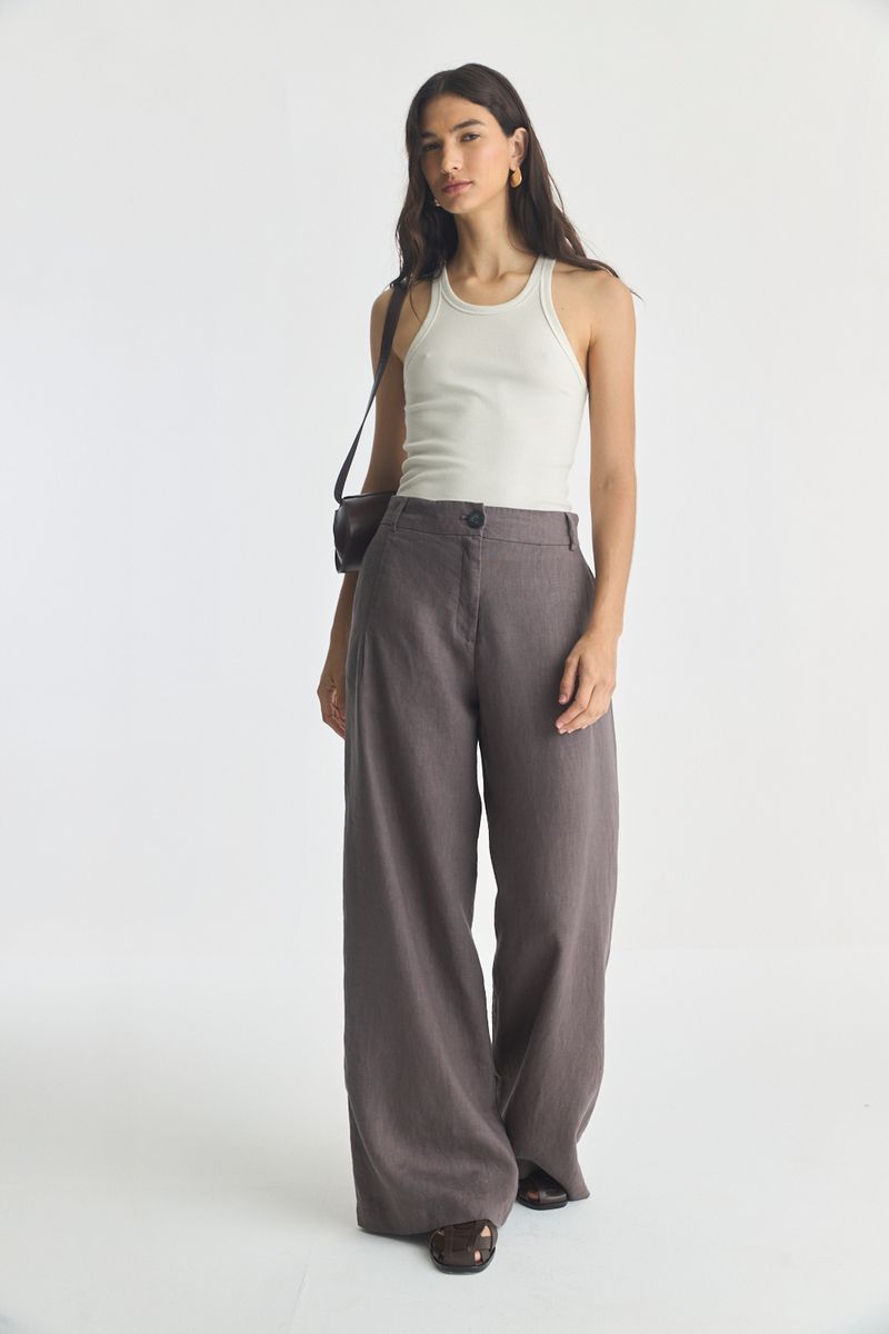 Pantalon 100%lino ancho, con bolsillos laterales, cintura con boton de pasta marcario y bolsillos ojal en la espalda
