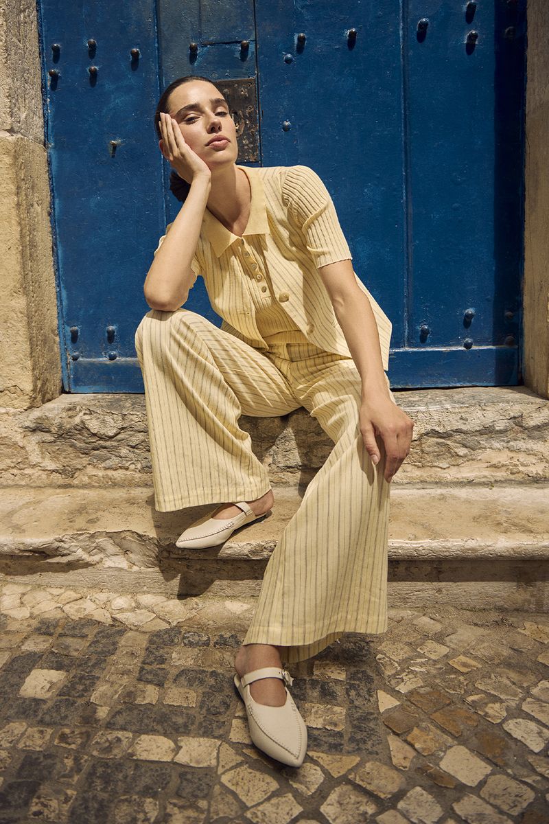 Pantalon rayado amarillo clarito con rayas en azul y cookie. Corte sastrero con broche interno en cintura, recorte en lateral y bolsillos laterales. Lleva pinzas en espalda y bolsillo ojal.