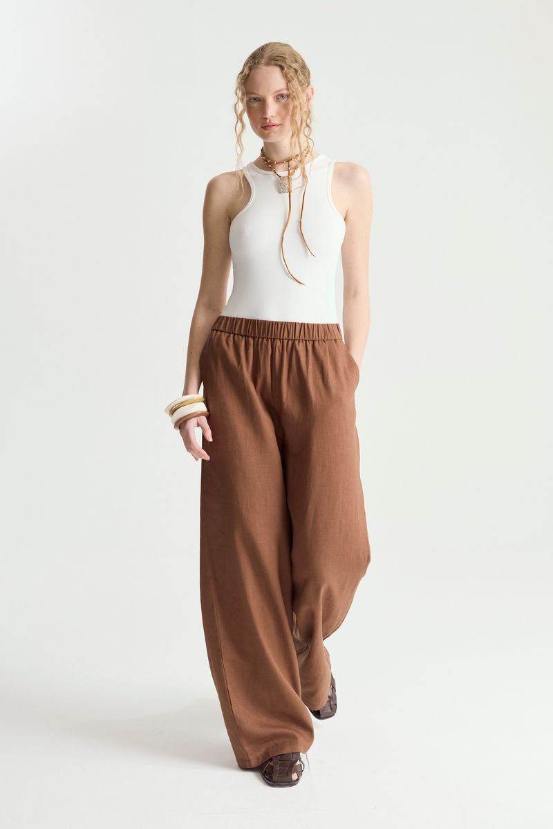 Pantalon jogger de lino viscosa, con elastico en cintura, bolsillos laterales . Silueta tiro alto, wide.
