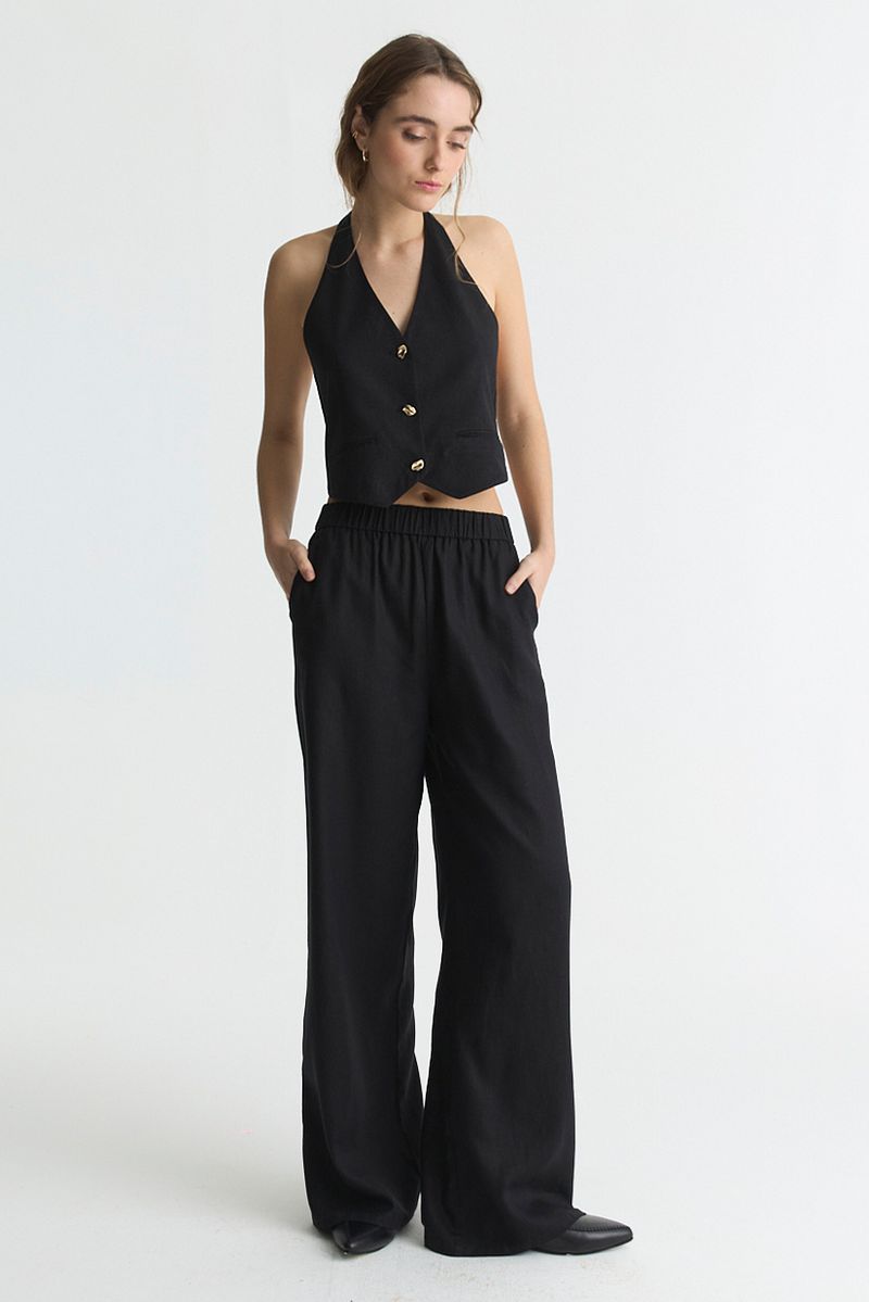 Pantalon jogger de lino viscosa, con elastico en cintura, bolsillos laterales . Silueta tiro alto, wide.