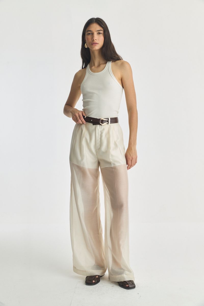 Pantalon de noche transparente con foreria tipo "short" . Es tiro alto con pinzas en frente, gancho sastrero en cintura y cierre. En espalda lleva bolsillos ojal y dos pinzas que le dan un buen calce.