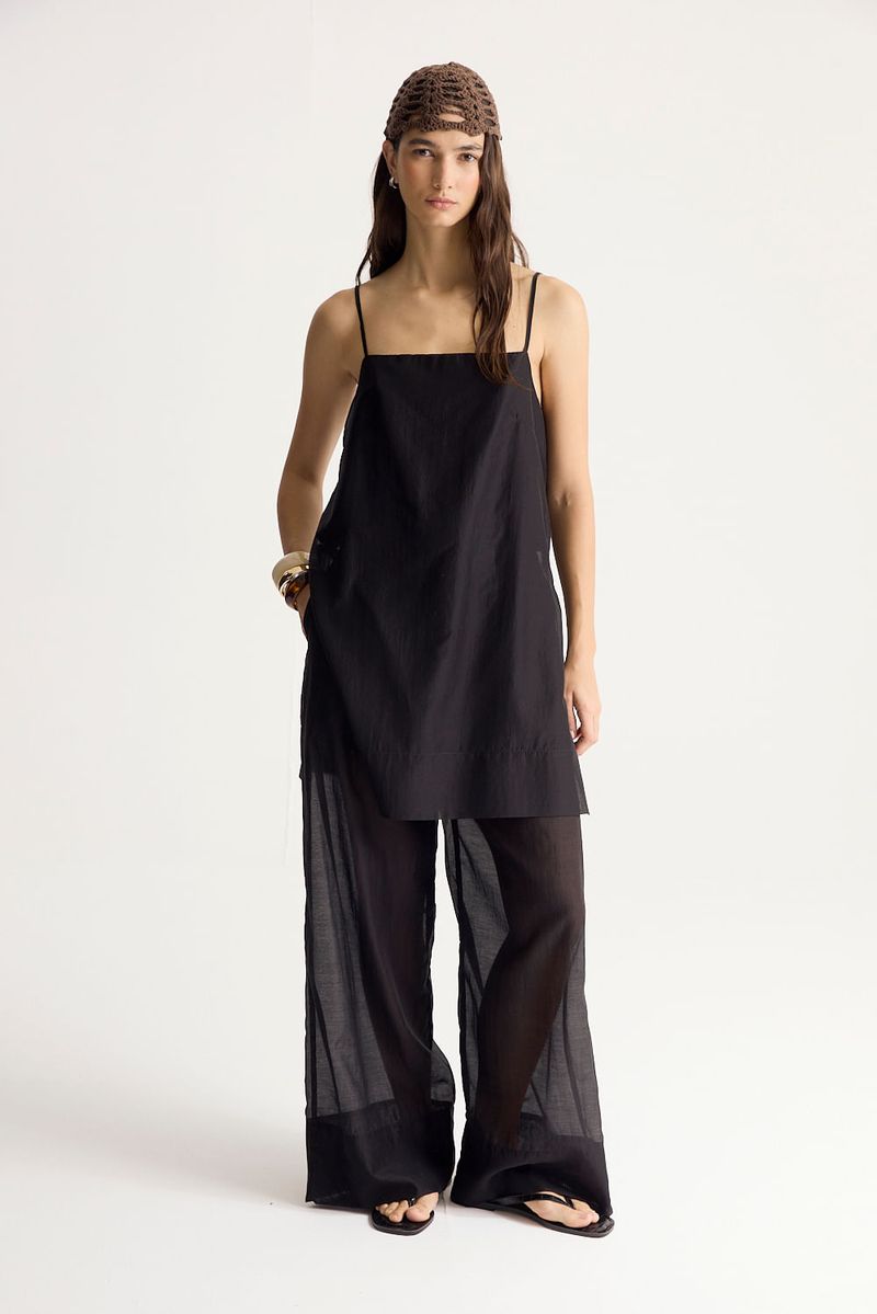 Pantalon de noche transparente con foreria tipo "short" . Es tiro alto con pinzas en frente, gancho sastrero en cintura y cierre. En espalda lleva bolsillos ojal y dos pinzas que le dan un buen calce