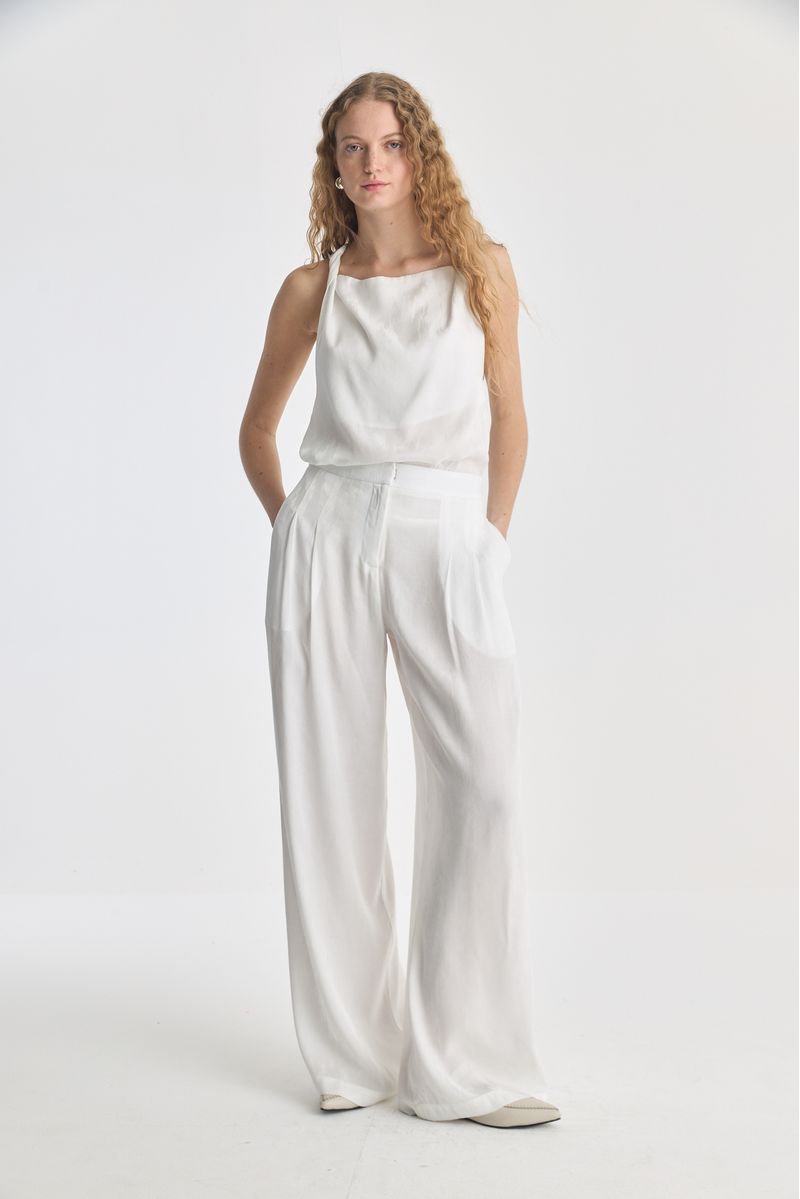 Pantalon de jackuard con lyocell en su composicion. Tiene un motivo tipo manchas en el diseño de jacquard. Calce tiro alto con pinzas en delantero, bolsillos laterales y amplio en botamanga.