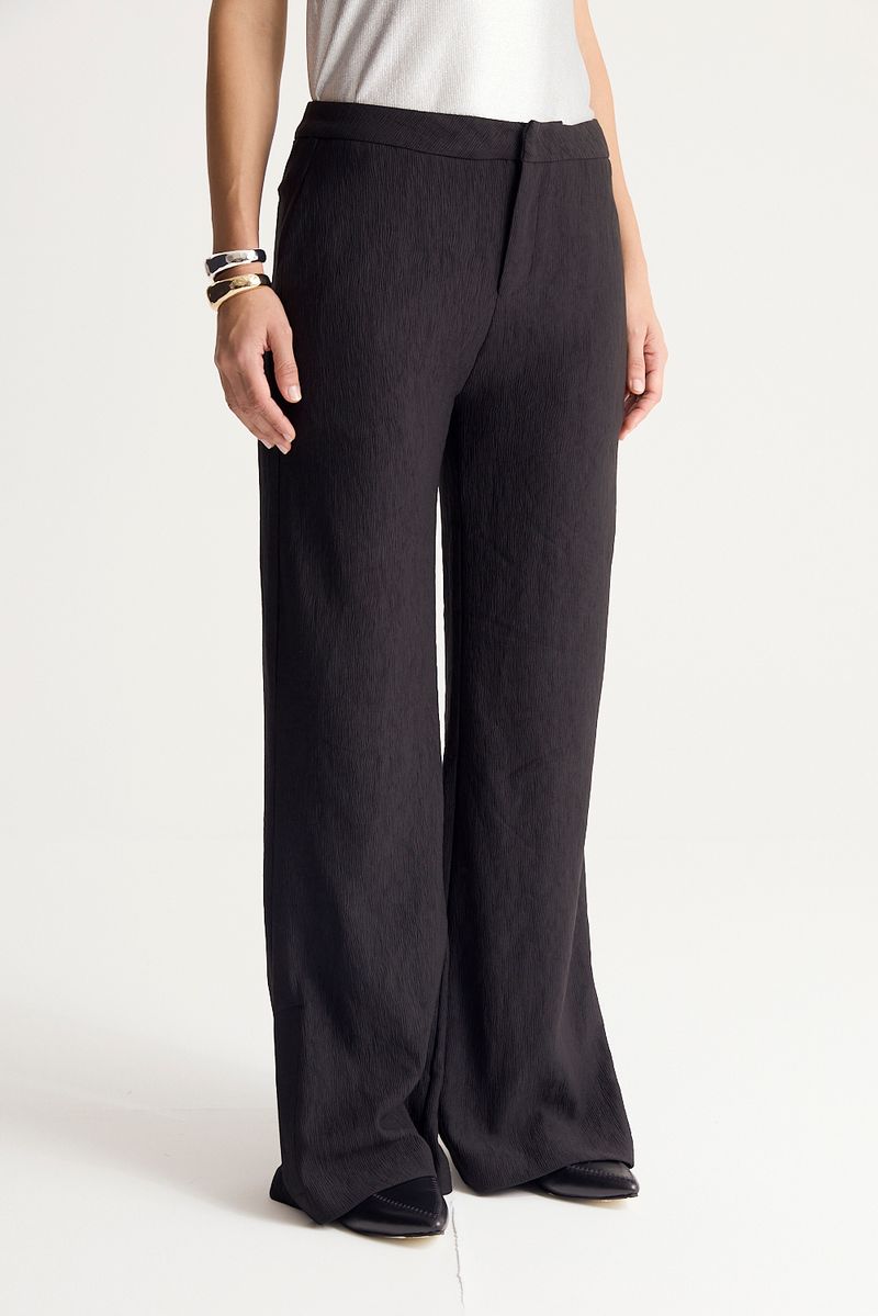 Pantalon ancho, de genero de algodon plisado irregular. Tiro alto, con bolsillos laterales y en espalda.